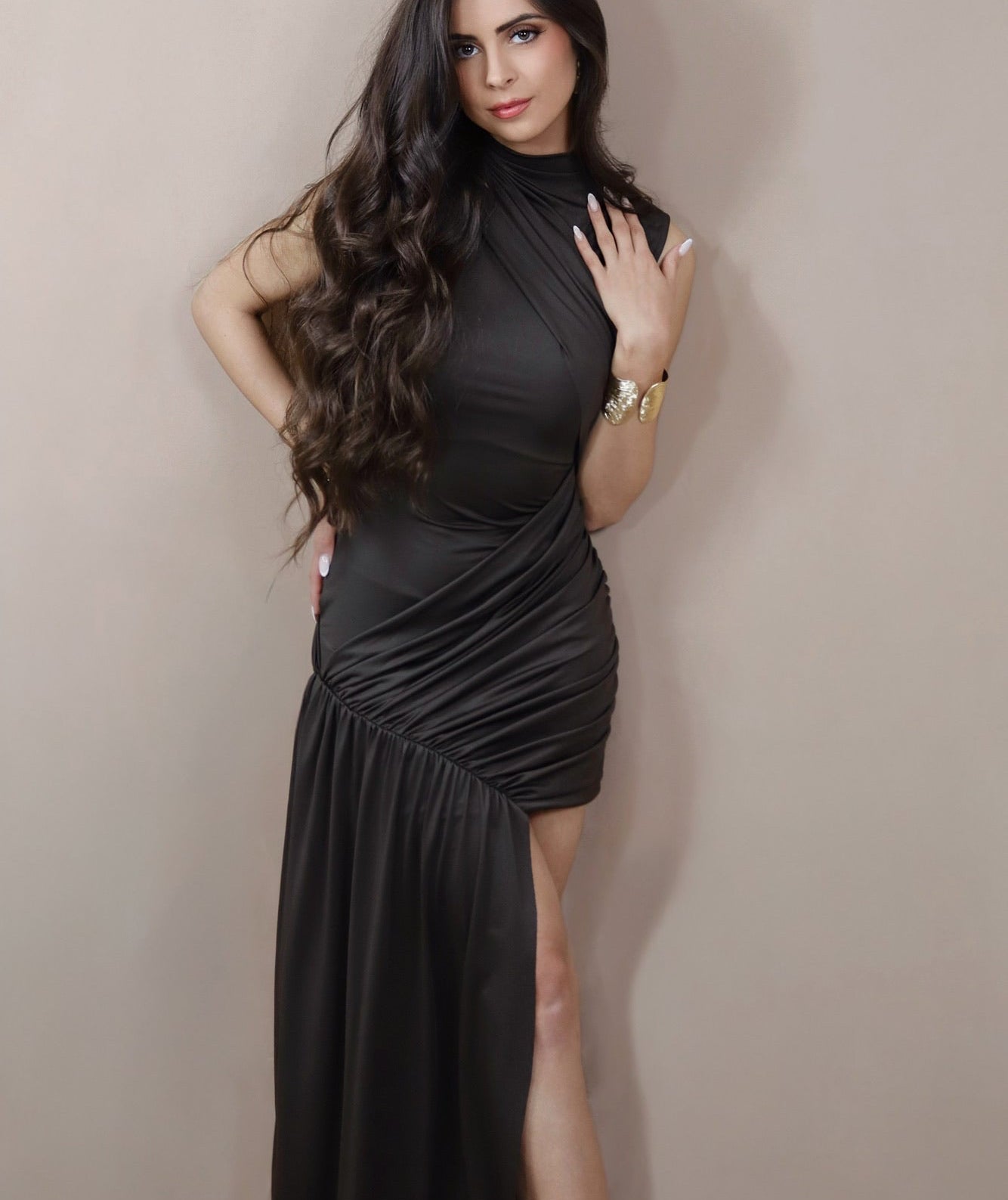 Élégante et ultra féminine, cette robe courte marron drapée sublime la silhouette avec sa coupe asymétrique et son drapé délicat sur la jambe. Son tissu fluide épouse les formes tout en offrant un tombé naturel et raffiné.