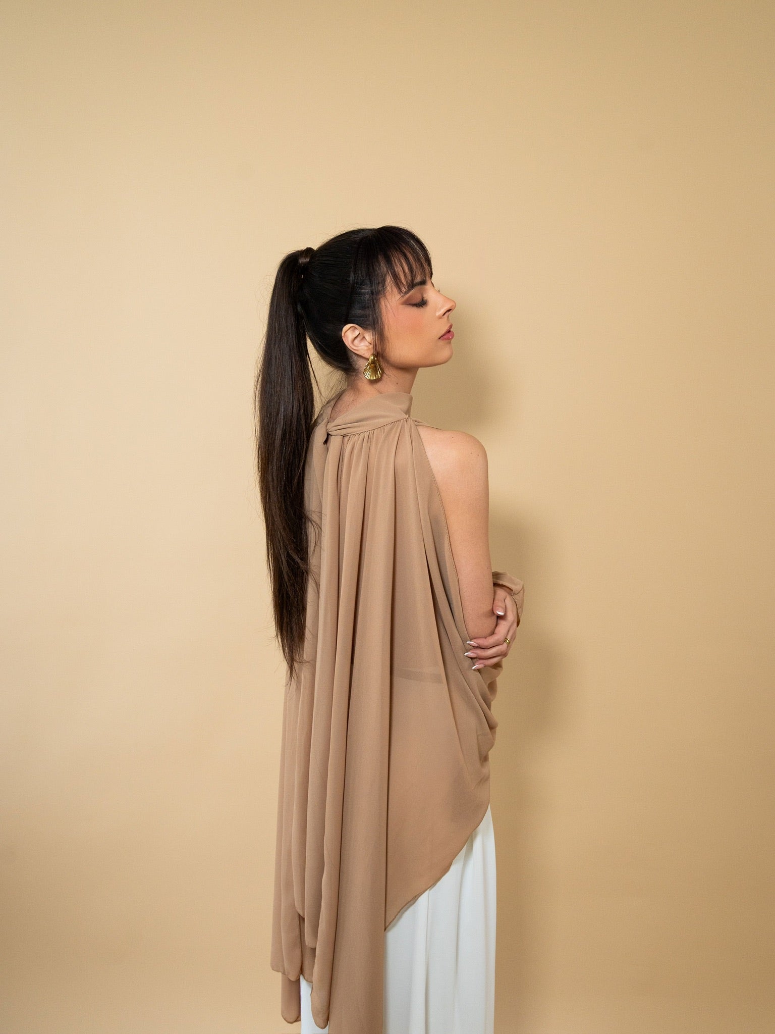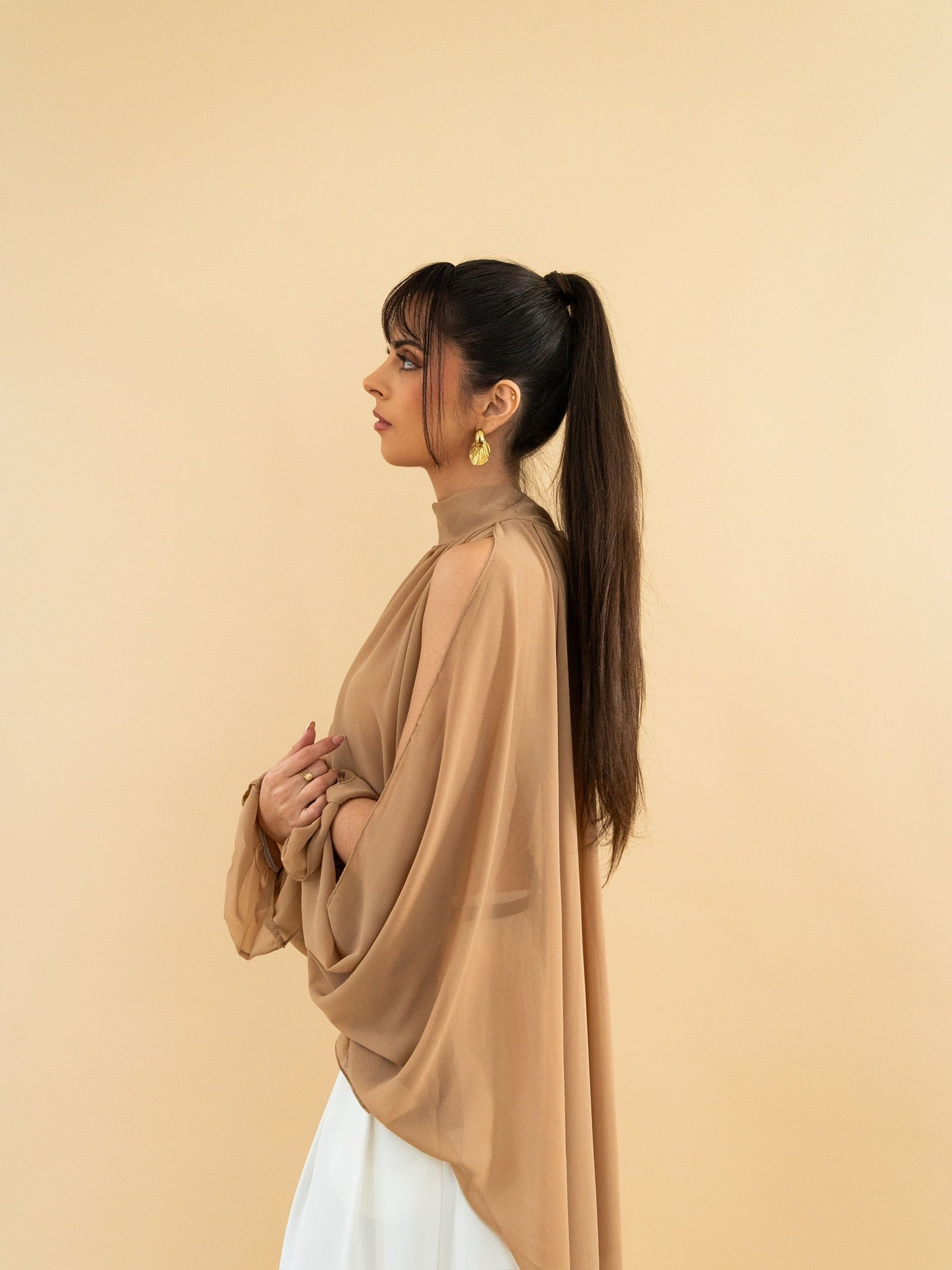 Blouse fluide coloris camel, confectionnée dans un tissu léger et aérien. Col montant avec fronces délicates à l’encolure pour un tombé élégant. Coupe ample et asymétrique à l’avant, offrant un effet drapé sophistiqué. Manches longues ouvertes effet cape, resserrées aux poignets par des finitions délicates.